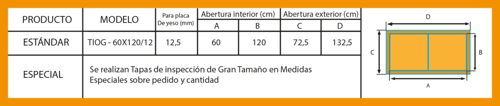 Dentro de la línea de Tapas de Inspección de Gran Tamaño TIOG, este modelo es el único modelo que se fabrica en forma estándar y se mantiene stock del mismo debido a su gran utilización en acceso a Equipos de Aire Acondicionado en cielorraso y otros accesos a instalaciones requeridos habitualmente en las obras.
